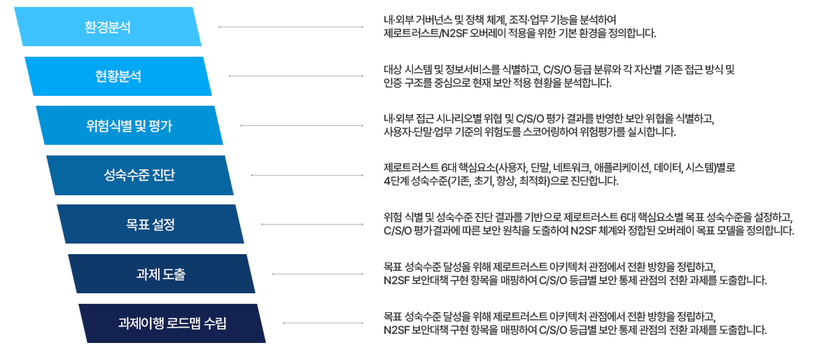 진단부터 아키텍처까지, 제로트러스트/N2SF를 실체로 구현합니다.