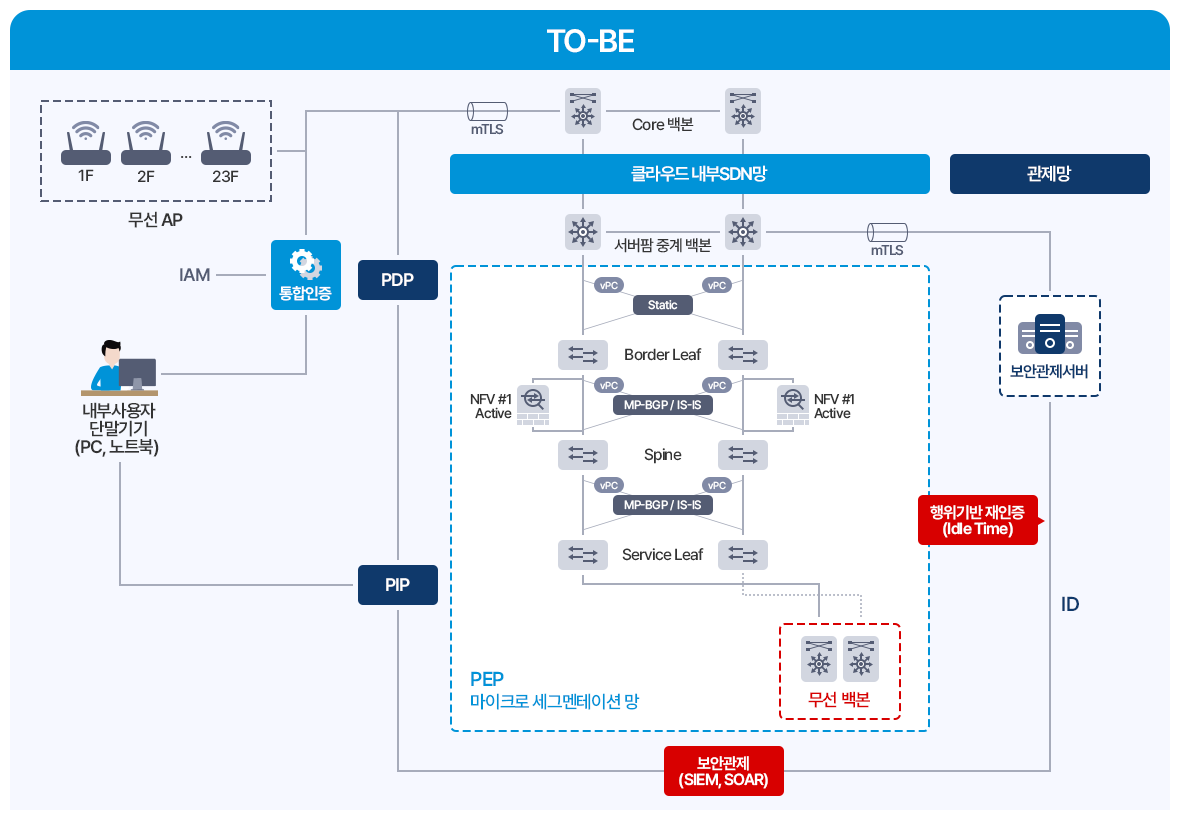 중요 업무 시스템을 대상으로 사용자·단말 기반 접근 통제와 세분화된 권한 관리 체계를 적용하여, 내부망 환경에서도 제로트러스트 원칙에 따른 보안 통제를 구현