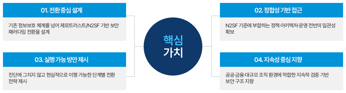 진단부터 아키텍처까지, 제로트러스트/N2SF를 실체로 구현합니다.