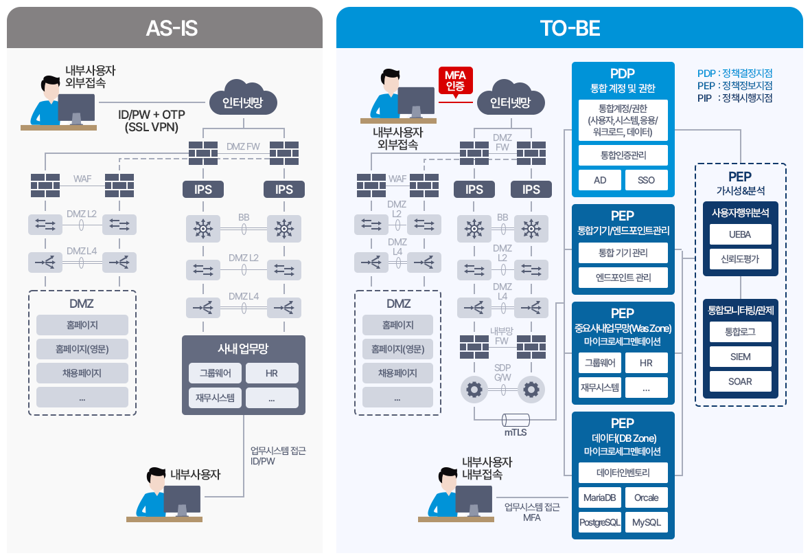 중요 업무 시스템을 대상으로 사용자·단말 기반 접근 통제와 세분화된 권한 관리 체계를 적용하여, 내부망 환경에서도 제로트러스트 원칙에 따른 보안 통제를 구현